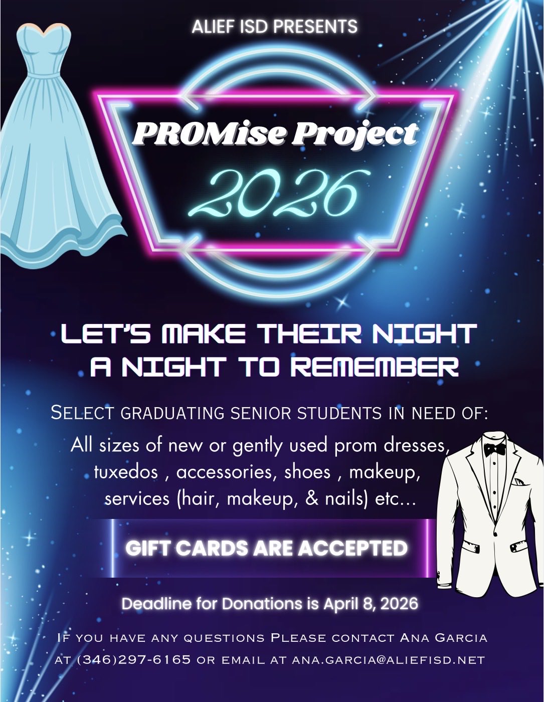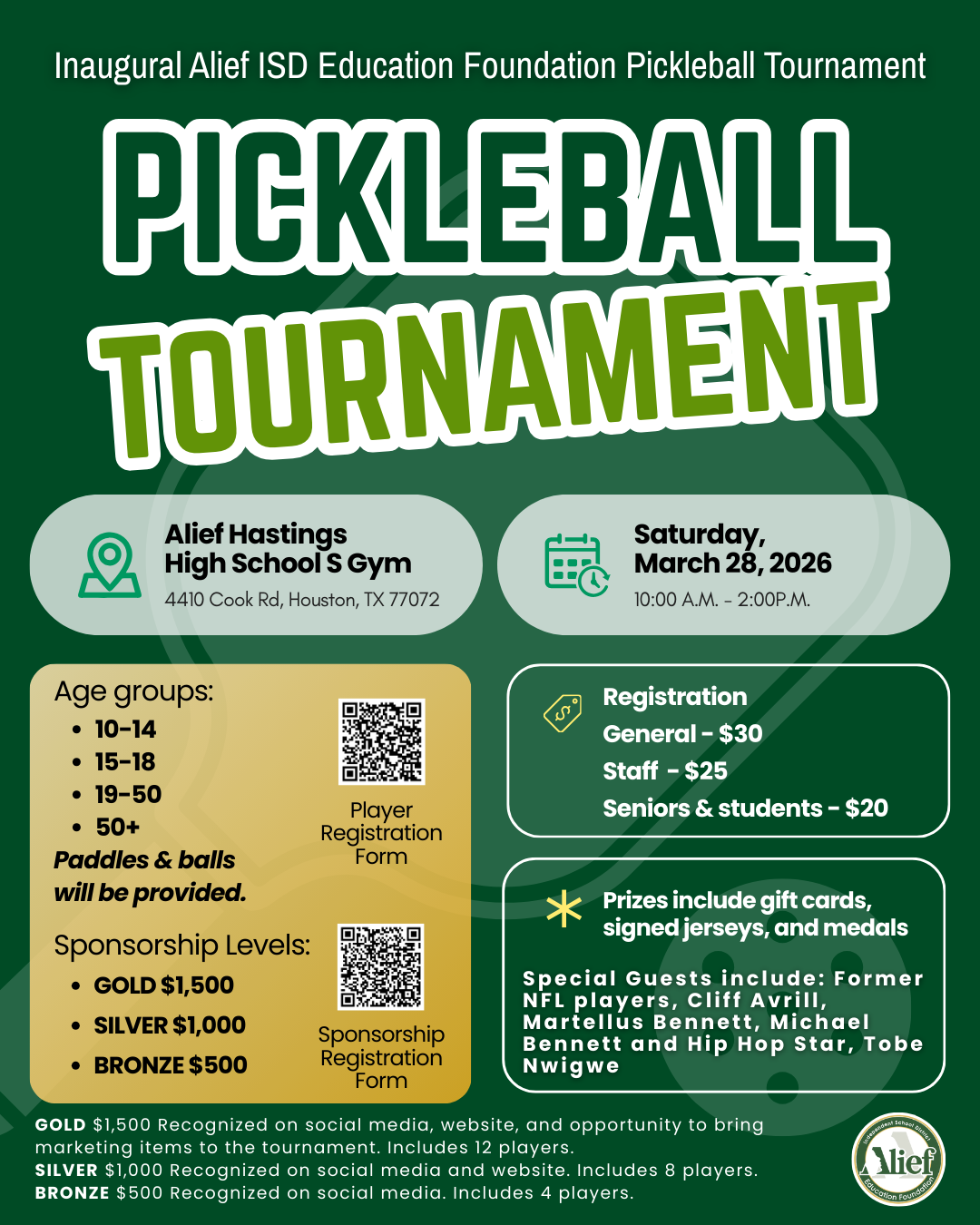 The “Friends of Deborah Brown Alexander Elementary” will be providing (3) $1,000 scholarships for Alief ISD graduating Seniors that will be pursuing a degree in Education. The application deadline is April 7, 2026, and winners will be announced on May 7, 2026. Link to the scholarship application |