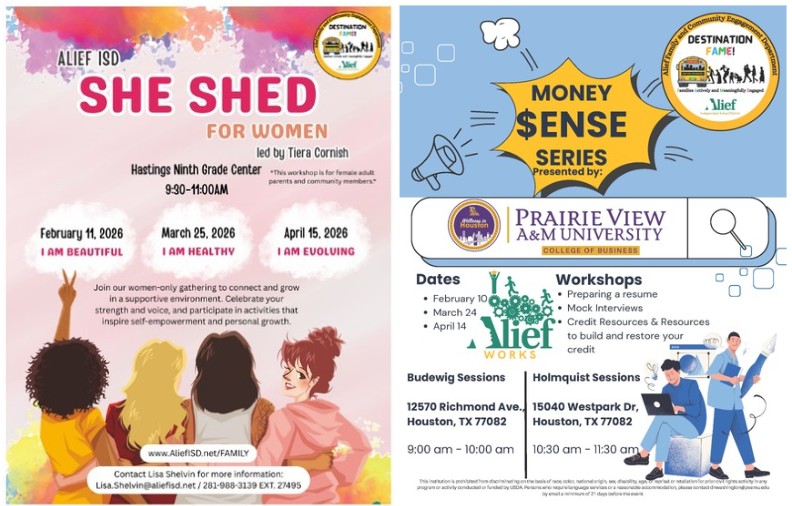 Join us as we kick off Spring semester in our Alief Family Centers! Free adult workshops and resources. Find a school near you! |