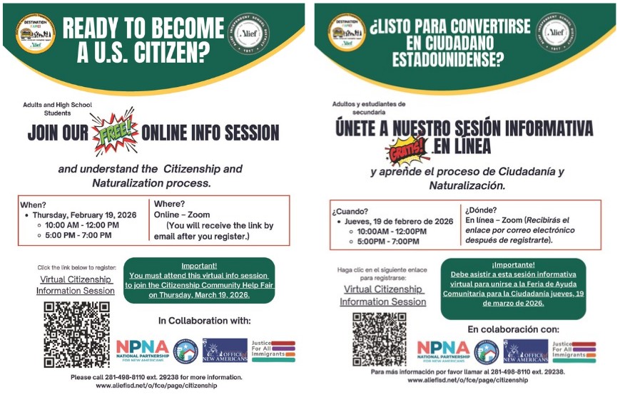 Enrollment for the 2026-2027 school year is now open for students entering grades K-12. We are excited to welcome both new and returning students to Alief ISD! Visit our Enrollment page to explore the wide range of academic opportunities available across our district, designed to meet the needs and interests of every learner. https://aliefisd.net/enroll Why Apply Now? •Get a head start on the school year •Ensure timely placement and scheduling •Access innovative programs and specialized pathways |